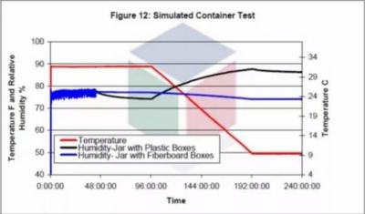 包裝中涉及到的滲透性材料如瓦楞紙盒、紙、墊木等可慢慢地從空氣中吸收水分,有效減少海洋運輸過程中溫度過低時,尤其是夜間,出現冷凝現象。如圖三中顯示,纖維板箱內的相對濕度要比塑料箱中的相對濕度低。該信息揭示了為什么許多汽車零部件制造商選擇從瓦楞紙箱改為可回收的塑料托盤時,包裝內會出現凝結現象,并且給金屬部件帶來銹蝕問題。