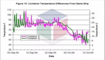 集裝箱在貨船上的位置恐怕是最難控制的變量之一,我們幾乎不可能預見或控制,但它卻會給整個運輸過程的環境帶來十分重要的影響。通過測量在同一船上運輸的多個集裝箱,我們發現位于船上不同位置的集裝箱之間存在溫度差異。如圖一中的2號集裝箱在整個航行過程中溫度變化呈漸變趨勢,而1號集裝箱則表現出波動跳躍的溫度變化。其中1號集裝箱裝載在貨船甲板上,光照直接影響了集裝箱的溫度變化,而2號集裝箱由于被其他集裝箱覆蓋,自然地控制了它的溫度變化。