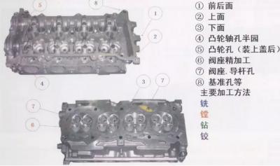 而這其中,又以圖中*號部分如汽缸蓋、汽缸體、曲軸等零件形位復(fù)雜,加工難度最大。本次我們從汽缸蓋開始,分享它們的主要加工面和加工方法。