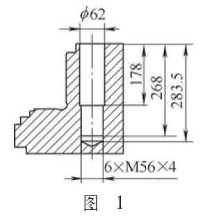 壓力缸的深孔螺紋加工在壓力機(jī)質(zhì)量方面起著至關(guān)重要的作用。常用螺紋銑刀都不是模塊式,且刀桿較短無(wú)法加工深孔,原機(jī)加工藝采用自制工裝接桿絲錐鉆攻6個(gè)M56(深268)螺紋,螺距為4mm(見(jiàn)圖1),經(jīng)過(guò)檢驗(yàn),螺紋塞規(guī)止端入。經(jīng)分析由于自制工裝接桿與絲錐焊接后同軸度不好,絲錐擺動(dòng),導(dǎo)致塞規(guī)止端入,缺乏有效的工藝手段和工藝方法。根據(jù)上述原因進(jìn)行攻關(guān)。