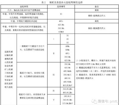 齒輪選用鋼鐵材料時,必須滿足兩個基本要求:一是加工和熱處理要求,其中包括鋼的機械加工性能、鑄造性能、鍛造性能和熱處理性能;二是使用性能要求,包括疲勞強度、熱處理規(guī)范和其他性能指標。齒輪常用鋼鐵材料的選擇、熱處理及性能見表1。調質及表面淬火齒輪用鋼的選擇見表2。