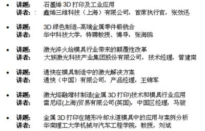 至于廣受業(yè)界認(rèn)可的“廣州國際模具及增材制造技術(shù)高峰論壇”,將于展會首兩天舉行,共有12場不同主題的會議,由行業(yè)專家主持或主講,講題覆蓋最新的3D打印技術(shù)及模具技術(shù)。部份重量級講者及題目包括: