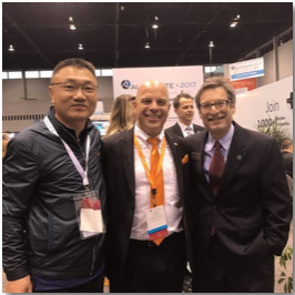 圖三(左下):中國機械工業聯合會展覽部副主任、中國機器人產業聯盟副秘書長陳家良先生和國際機器人聯合會主席Mr. Joe Gemma先生、 美國機器人工業協會會長Mr. Jeff Burnstein先生在AUTOMATE現場