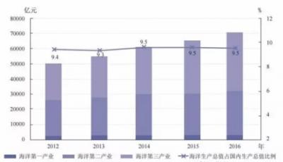2016年,全國海洋生產(chǎn)總值70507億元,比上年增長6.8%,占國內(nèi)生產(chǎn)總值的9.5%。其中,海洋產(chǎn)業(yè)增加值43283億元,海洋相關(guān)產(chǎn)業(yè)增加值27224億元。