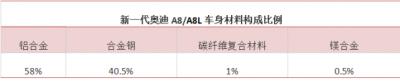 新一代奧迪A8車身材料種類增加到了4種:鋁合金、合金鋼、碳纖維復(fù)合材料、鎂合金。4種材料按照種類再進(jìn)行細(xì)分的話,共有29種,其中包括11種鋼材、16種鋁材、1種鎂材和1種碳纖維復(fù)合材質(zhì),這也是奧迪A8車身首次應(yīng)用碳纖維復(fù)合材料。