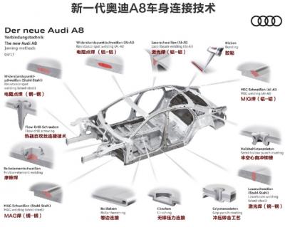 在奧迪4月發(fā)布的關(guān)于新一代奧迪A8的新聞中,我們看到,相比現(xiàn)款車型,新一代奧迪A8車身骨架大量應(yīng)用輕量化材質(zhì),車身不同部位將最輕的質(zhì)量和最優(yōu)的性能結(jié)合在一起,共同構(gòu)成整個車架。車身材料種類更多,車身連接技術(shù)更加先進(jìn)。
