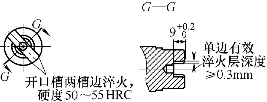 槽類零件淬火的關鍵點如下:感應器結構及有效加熱面結構,感應器與淬火部位的間隙,淬火工藝參數(頻率、功率、加熱時間等)的匹配,臨近淬火區防回火冷卻系統。