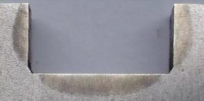 根據上述試驗,進行如下修正:將底邊間隙加大為1~1.5mm,采用5.8kHz、98kW進行加熱淬火,加熱時間延長至6.5s加熱淬火(注意:加輔助冷卻系統防止臨近開口槽淬火區回火)。檢測結果:槽兩側邊表面硬度55~56HRC,Ds=2mm;R2mm處表面硬度55HRC,Ds=1.5mm;槽底面表面硬度56HRC,Ds=3mm(見圖9)。檢測結果均達到技術要求。