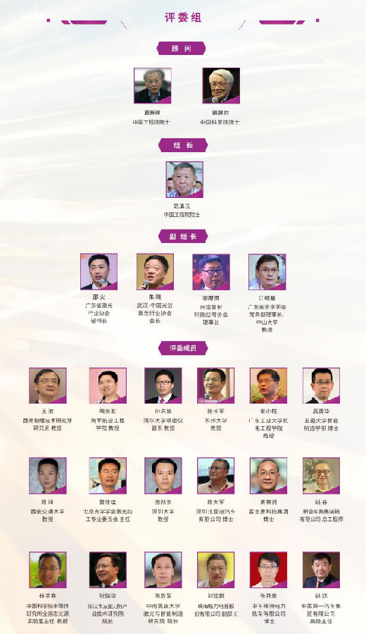被譽為國內激光行業最高榮譽的獎項,擁有龐大、專業、權威的評審團,以中國工程院院士周壽桓、中國科學院院士姚建銓為顧問,中國工程院院士范滇元為評審組長;邀請到廣東省激光行業協會、武漢中國光谷激光行業協會、臺灣雷射科技應用協會、廣東省光學學會的理事長、秘書長等擔任副組長;另有清華大學、西安交通大學、西南技術物理所、海軍航空大學、廣東工業大學、陽江五金刀剪研究院、裝甲兵工程學院、蘇州大學、五邑大學等知名單位的激光專家,以及來自比亞迪、富士康、格力電器、中集集裝箱、中車株洲、長春一汽等大型企業的技術高管擔任評委。