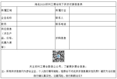 鄭州工博會(huì)組委會(huì)將在2020年展會(huì)現(xiàn)場免費(fèi)提供自主供求對(duì)接展示墻,所有到會(huì)參觀的企業(yè)均可在觀眾換證處免費(fèi)領(lǐng)取供求對(duì)接信息表,并粘貼至現(xiàn)場供求展示墻,保證企業(yè)更大的收益,為中西部企業(yè)供需對(duì)接提供更便捷的服務(wù)!海名鄭州工博會(huì)讓供求對(duì)接更便捷!