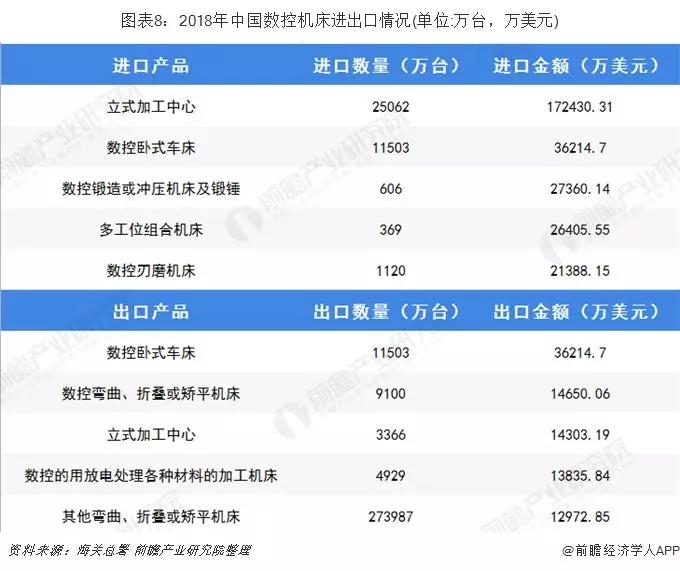 2018年,我國數控機床進口產品中數控臥式車床進口數量最多,約1.15億臺,立式加工中心進口總額最高,為17.24億美元;我國出口產品中其他彎曲、折疊或矯平機床出口數量最多,為27.40萬臺,數控臥式車床出口金額最高為3.62億美元。