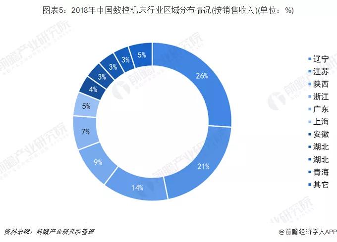 從2018年我國數控機床銷售收入的分布來看,遼寧、江蘇、陜西、浙江、廣東位于前列,分別占我國前十數控機床銷售收入的26%、21%、14%、9%、7%。中國數控機床行業CR3為61%,CR5為77%,CR10為95%,我國數控機床行業集中度較高。