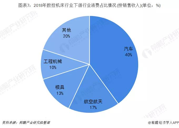 2018年,數控機床行業下游行業消費占比中,汽車行業比重最大占比約為40%,航空航天位居第二,占比約17%,二者約占我國下游行業總消費的50%左右。