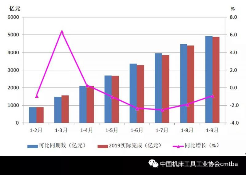從宏觀層面看,國內生產總值GDP同比增速持續下降,今年前三季度GDP同比增速為6.2%。國統局10月制造業采購經理人指數PMI為49.3%,連續6個月低于榮枯線。1-9月全社會固定資產投資同比增長5.4%,其中制造業投資同比增長2.5%,作為機床工具產品主要用戶行業的汽車制造業,投資同比增長1.8%。制造業、汽車制造業的投資增速都明顯低于全社會投資增速。