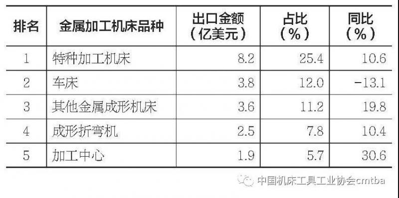 從表3可見,出口前五位的品種除車床外同比均明顯增長。值得注意的是,加工中心出口同比增長高達30.6%,與進口同比的大幅度降低形成鮮明的對比,出口增幅大的原因是產品競爭力的提升還是與制造業轉移有關還需進一步研判。