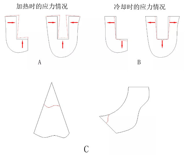 熱處理的工藝過程都要經(jīng)過加溫和冷卻來實現(xiàn)。工件的尺寸和形狀不同,必然影響受熱加溫和冷卻散熱的狀況。在工件的槽口處易于造成應力集中現(xiàn)象,槽口處的應力值往往幾倍于其他截面處的平均應力值。槽口處的圓角半徑愈小,則顯現(xiàn)應力集中的現(xiàn)象愈嚴重 (如A、B圖)。在尖銳棱角處也是最易于形成應力集中的地方(如C圖)。
