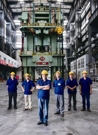 二重集團副總工程師陳曉慈(左三)與幾十位工程師建造了世界最大的8萬噸模鍛壓機。