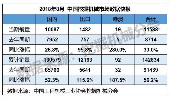根據中國工程機械工業協會挖掘機械分會行業統計數據,2018年1—8月納入統計的25家主機制造企業,共計銷售各類挖掘機械產品142834臺,同比漲幅56.2%。國內市場銷量(統計范疇不含港澳臺)130579臺,同比漲幅52.3%。出口銷量12163臺,同比漲幅115.6%。
