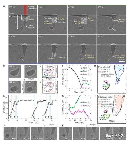 激光粉末床熔合(LPBF)是目前使用最廣泛的金屬添加劑制造工藝,正在徹底改變制造業。在典型的LPBF工藝中,在數字計算機輔助設計與制圖(CADD)模型的指導下,用高功率密度的激光掃描薄薄的粉末層,對金屬粉末進行局部熔化,并將其熔合到前一層。盡管LPBF具有無與倫比的直接制造具有復雜幾何形狀的零件的能力,但相關的孔隙率仍然是其致命弱點,因為這會損害產品的性能(例如,耐腐蝕性和疲勞壽命)。深入的研究工作促進了對孔隙度的理解和控制。高速同步x射線成像顯示,在導致氣孔的各種機制中,熔化的“鑰匙孔”模式由于其在激光焊接尤其是LPBF中的重要性,近年來引起了廣泛的關注金屬快速蒸發產生的強大反沖壓力將周圍的熔體液體向下推,形成一個又深又窄的洞,稱為“鑰匙孔”。在鑰匙孔內,激光束經過多次反射,大大提高了激光的吸收,提高了能量效率。但是,在某些激光條件下,鑰匙孔壁會不斷波動并坍塌。該過程通常歸因于熱毛細力、馬朗戈尼對流、反沖壓力和氣體等離子體的出現。這種鑰匙孔的不穩定性會產生孔,如果孔被凝固前沿捕獲,則孔會成為構件中有害的結構缺陷。功率-速度(P - V)圖直接涉及產品的質量(密度或孔隙率)工藝參數。在P-V圖的物理基礎中,一個缺失的部分是所謂的“鑰匙孔孔隙邊界”,它將生產出名義上完全致密的零件的加工條件與那些有氣孔的零件分離開來,這個邊界是否明確并可重復使用。此外,與激光裸板熔化相比,在LPBF中,粉末的存在與較大的鎖孔波動和較大的孔形成有關。然而,對邊界和任何由粉末引起的位移缺乏量化。清華大學機械工程系趙滄教授,卡內基梅隆大學Anthony D. Rollett和弗吉尼亞大學Tao Sun等人使用原位高速在第三代高能X射線成像光源完成這塊丟失的P-V圖。通過定量描述鎖眼孔隙邊界,闡明粉的效果,揭示鎖眼孔的基本來源和他們在LPBF過程中的初始運動。觀察到Ti-6Al-4V小孔形成過程的細節,這些小孔是由小孔尖端的嚴重不穩定性引起的。關鍵的鎖孔不穩定性在熔體池中產生聲波,為鎖孔尖端附近的氣孔提供額外而重要的驅動力,使其遠離鎖孔并成為缺陷。這一發現為鎖孔形成的原因提供了新的認識。相關研究成果以題“Critical instability at moving keyhole tip generates porosity in laser melting”于北京時間2020年11月27日在Science上發表。在有或沒有粉末存在的情況下,將鑰匙孔孔隙度狀態與穩定熔化狀態區分開的鎖孔孔隙度邊界出乎意料的平滑和鋒利(圖1A)。越過邊界朝著更高的能量密度,可識別的孔從鑰匙孔底部釋放到液體中(圖1B)。在恒定的激光功率下,最大孔徑都隨著掃描速度的降低而上升。少數情況偏離了這種趨勢,最可能是由于不同樣品中粉末床厚度的變化以及相對于孔形成事件而言,X射線成像可用的時間窗口較短。